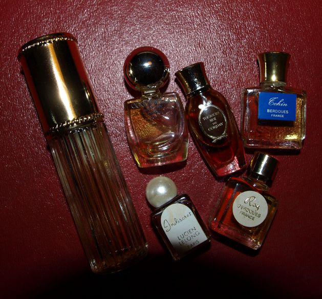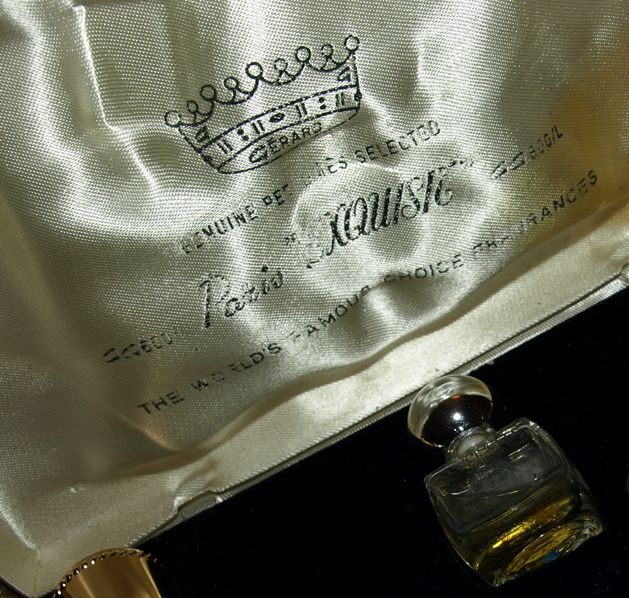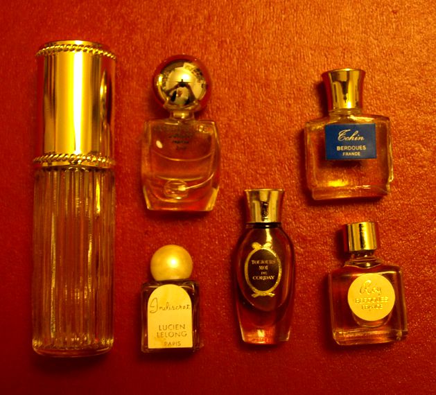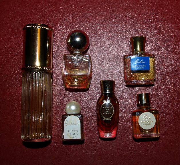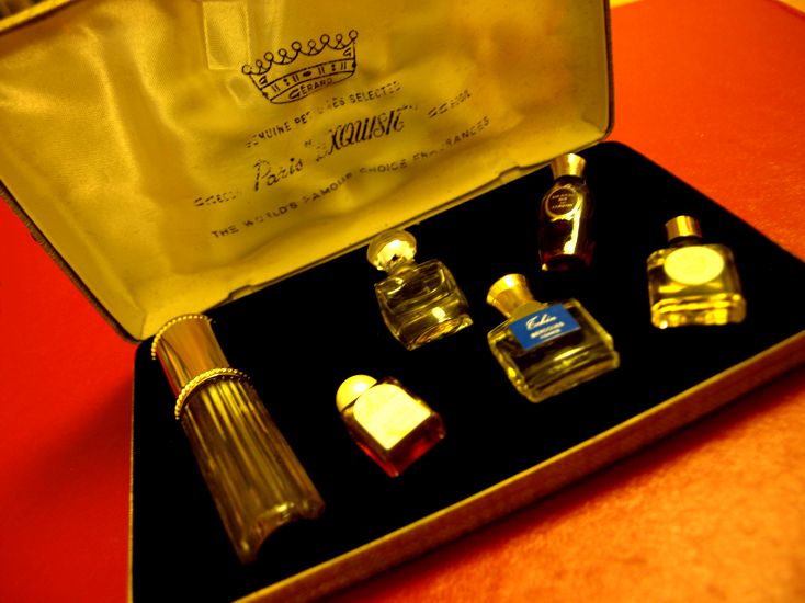 No tak je to tady, ten slavný okamžik. Výběr vůní tradičních grasských parfumérů: Berdoues, Lucien Lelong, Corday, de Vigny v trochu ušmudlané krabičce. Turistické krabičky s výběrem „pařížských“ parfémů jsou dodnes oblíbeným suvenýrem. Dnes v nich bývá mAinstream od Coty, ještě nedávno Nina Ricci, Givenchy, Lavin a ještě dřív lahvičky plné grasských domácích medicín. A takovou jsem ulovila za pár korun na e-bayi já.