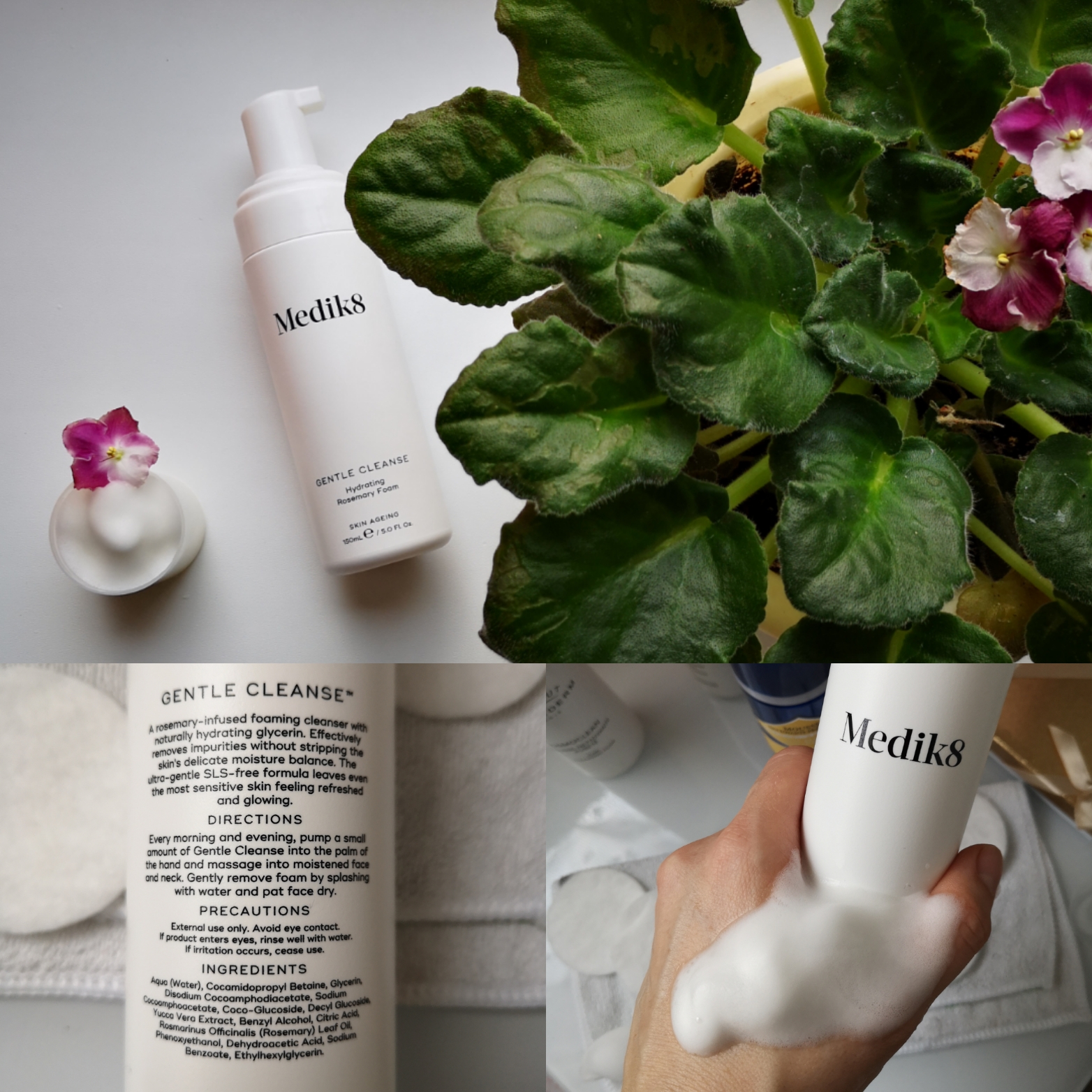 Po predchádzajúcich skúsenostiach s čistiacimi penami, som mala dobrú penu spojenú s bohatou, hustou a nadýchanou textúrou. Lacné a menej účinné boli rýchlejšie topivé a redšie. Keď som prvý raz skúsila Gentle Cleanse, sklamalo ma, že sa radí textúrou do kategórie číslo dva. V hlave som ju vyradila ešte pred prvotným skúsením, ale keďže som si ju vybrala na testovanie (barter s Medaprexom), musela som testovať. Navlhčila som tvár a penou ju masírovala s myšlienkami, „Čo som komu urobila“… V ten deň som mala na sebe riasenku Bourjouis Reveal, ktorú radím k horšie odlíčiteľným a vždy som ju musela dočistiť s tampónom. Zmyla som penu, chytila tampón s nakvapkaným olejom a mrkla do zrkadla. Táto rozmarýnová pena mi to natrela. Riadne. Očné okolie bolo čisté!