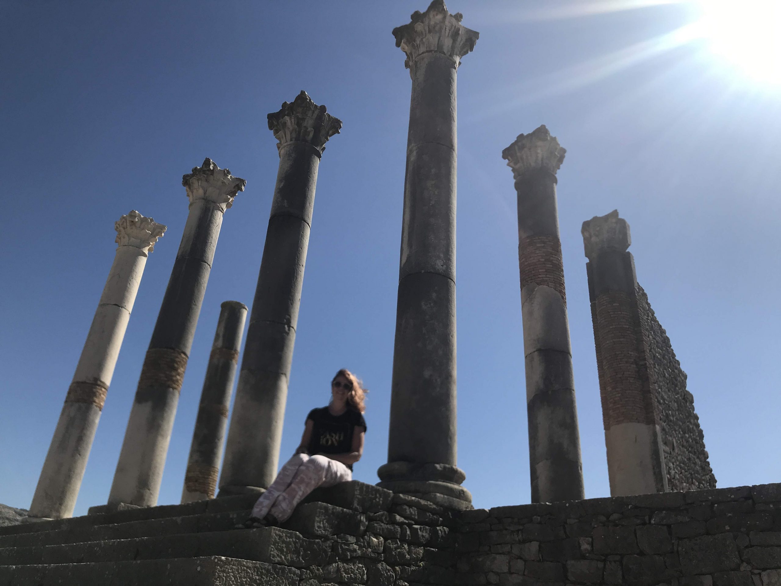Jestli, jak tvrdí wikipedie, je Volubilis „částečně“ odkryté římské město, pak tam nutně museli mít nějakou MHD. Rozlehlejší římskou památku nemají ani v Římě. Porušila jsem zde pravidlo číslo jedna v těchto zemích: nedávej se do řeči s místními. No a dát jim vlastní mobil do ruky, to už svědčí něco málo o mé retardaci, viz výše. Dala jsem. Mobil teda. A vznikly fotky, které by jinak nevznikly. Mobil jsem dostala zpátky. Fotky super. Zpětně k nezaplacení, byť v tu chvíli mi cena, o kterou si místní mladík řekl, přišla nemístná. Navíc, my tam fakt skákali … v našem věku! Už jen ten sportovní výkon je třeba ocenit. Kýč? Jasně. A co!? Radost!