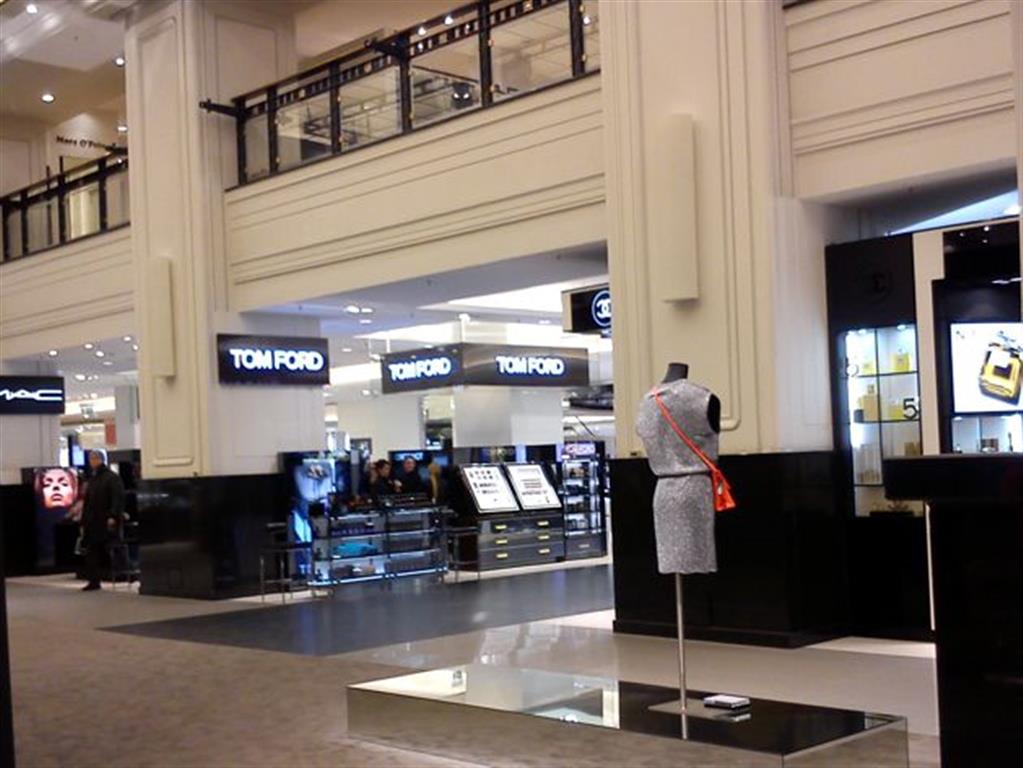 No a především kosmetiku! Především pro mne, jinak je kosmetika jen půlpatro z rozlehlých 5+4 podlaží, nicméně koncentrace krásy je asi jako atomů v antihmotě. Tolik flakonků, krabiček, trubiček, věciček, pudříků a reklam naňahňaných na jednom místě jsem ještě neviděla – nikdy! Prostor je velký, ale množství značek s plným sortimentem je ohromující.